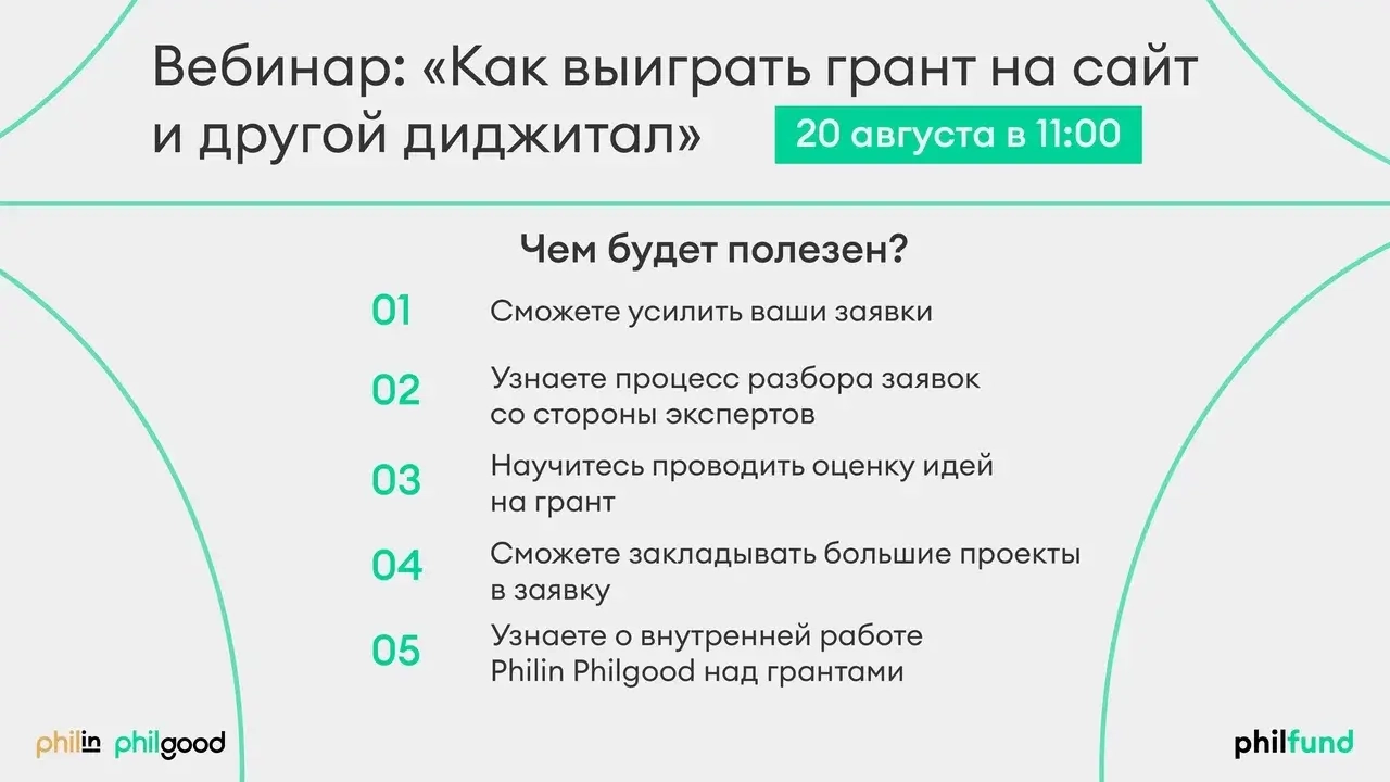 Предоставляем и помогаем получить софинансирование НКО на услуги группы компаний Philin Philgood: совместно с организацией участвуем в написании грантовых заявок, проводим конкурсный отбор на финансирование услуг по комплексному сопровождению.